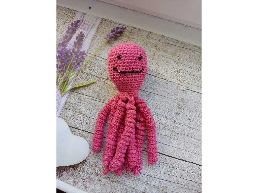 Materiál: 100% měkká vlna, výplň duté vlákno; Barva: růžová hlavička i chapadla; Rozměry: výška hlavičky 8 cm, délka chapadel 11 cm, celková šířka po roztažení chapadel 25 cm