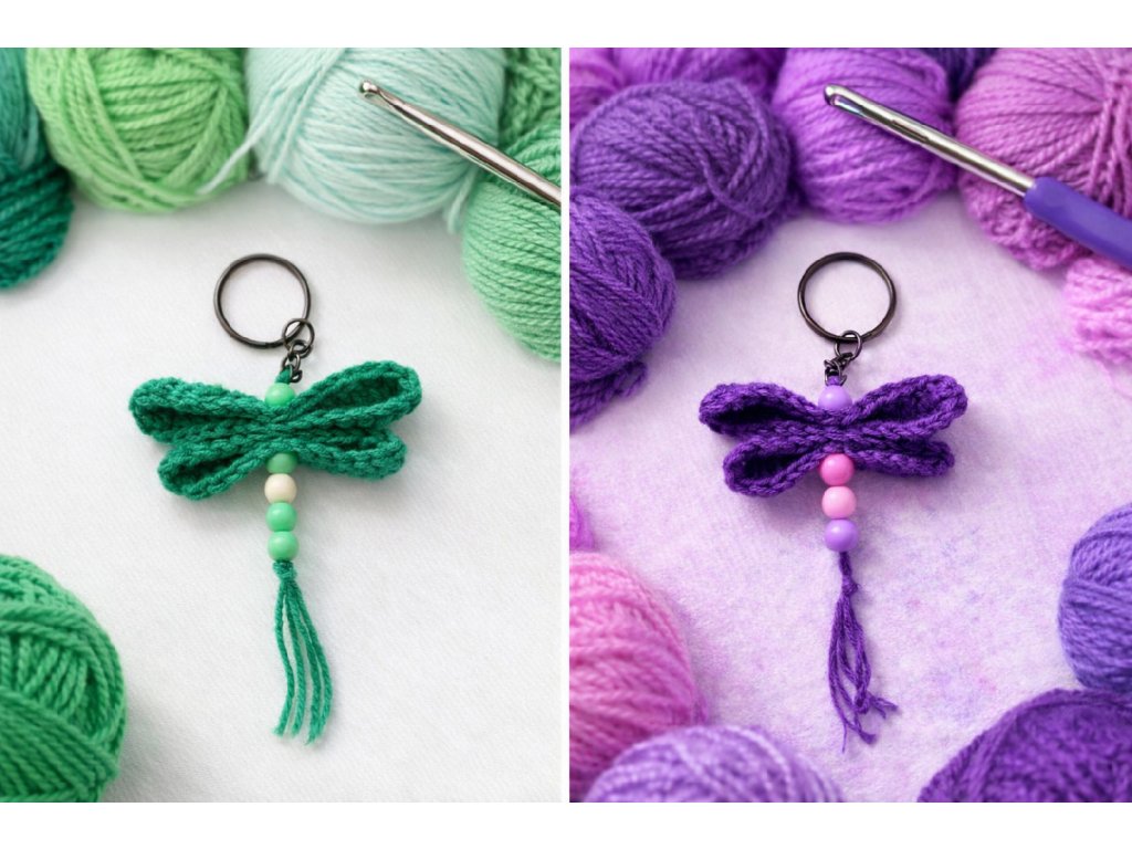 Vyrobeno z kvalitní příze, doplněno korálky a kovovým kroužkem na klíče.